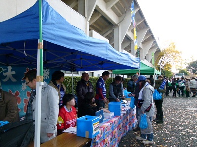 昨日は、NonuガールズのAちゃんと横浜のニッパツ三ツ沢競技場に行ってきました。先月にもトップリーグの試合観戦のために訪れたこちらの競技場。前回同様に横浜駅からバスで向かいました。釜石シーウェイブスの試合を見るのは今回が初めてです。会場入り口のすぐ側に両チームのテントが並んでいました。ダイナボアーズのテントで「ファーストトライは誰だ!」の投票をすべく、メンバー表とにらめっこ中のAちゃん。まーこ。はTom Donnellyに一票を入れました。(↑証拠写真はありませんけど、ホントです。)この試合は有料でしたが、とある方のご厚意でチケットを2枚プレゼントしていただきました。ちなみに、この方も「まーこ。」さん。本名が「ま●こ」さんなのだそうです。前日はあいにくの雨。土曜も朝からどんよりとした曇り空。でも、お昼前から太陽が出てラグビー観戦日和となりました。ダイナボアーズのメンバーもウォーミングアップ開始。え、もしかして、今日も蹴っちゃうの?????しかーし。事件はおきました…。バックス陣とフォワード陣別々のウォーミングアップを終えチーム全体でのウォーミングアップが始まってから間もなく約一名、ここで動きが止まってしまったのです…。すでにブーツを脱いでしまっている選手約一名。そうです、いつも試合終了と共にブーツを脱ぐTom Donnelly。右足に何かアクシデントが起きたんでしょうか…。関係者の方が、両手で小さく「X」を作る仕草が見えました。そしてこのまま、Tom Donnellyは欠場が決定。試合が始まる前から、アタシの「ファーストトライは誰だ!」の投票は外れる結果となりました。。。そして午後1時キックオフ。先月の黒羊組の試合はバックスタンドから観戦しましたが、今回はメインスタンドでダイナボアーズの応援団の近くに座りました。ラグビーとサッカーの専用競技場のため、ピッチがとても近いのは嬉しい限り。先制したのはダイナボアーズ。前半終了直前に釜石シーウェイブスの初トライが決まりました。応援名物の大漁旗を掲げて喜ぶファン。マスコットも大喜び。試合後半の模様は後ほど。(続く。)
